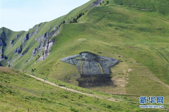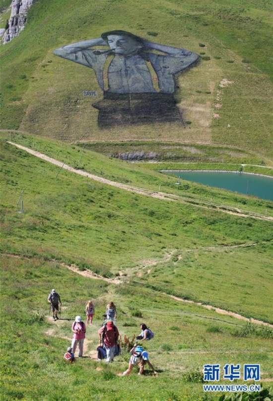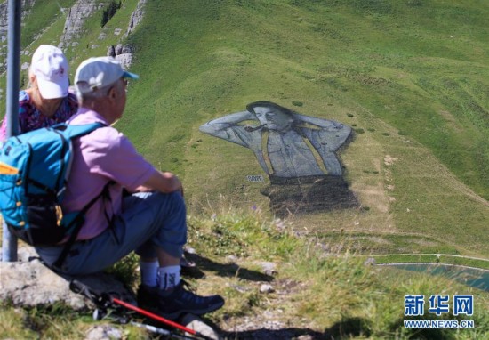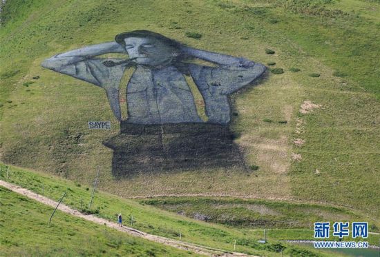 8月8日,由法國藝術(shù)家塞貝(SAYPE)創(chuàng)作的可生物降解畫作在瑞士萊森附近的阿爾卑斯山上進行展示。該畫作長100米、寬100米,用面粉、亞麻籽油、水和可生物降解的天然色素等純天然材料繪制而成。據(jù)悉,這幅以瑞士牧羊人形象為基礎(chǔ)創(chuàng)作的巨型畫作將只能在阿爾卑斯山上存留大約三周時間,之后會自然消失。 新華社記者 徐金泉 攝