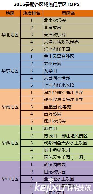 具體到各個(gè)區(qū)域,暑期華北地區(qū)最熱門的五個(gè)景區(qū)為:北京歡樂谷、北京故宮、天津歡樂谷、天津方特歡樂世界、樂島海洋王國;華東地區(qū)最熱門的五個(gè)景區(qū)為:黃山風(fēng)景名勝區(qū)、蘇州樂園、九華山、天目湖水世界、上海海洋水族館;華南地區(qū)最熱門的五個(gè)景區(qū)為:深圳小梅沙海洋世界、福州羅源灣海洋世界、寶墨園?南粵苑、百萬葵園、深圳歡樂谷;華西地區(qū)最熱門的五個(gè)景區(qū)為:峨眉山、青城山—都江堰風(fēng)景區(qū)、成都國色天鄉(xiāng)水上樂園、閬中熊貓樂園、國色天鄉(xiāng)樂園(一期);華中地區(qū)最熱門的五個(gè)景區(qū)為:武漢園博園、世紀(jì)歡樂園、亞馬遜水上樂園、平江石牛寨旅游區(qū)、洛陽白云山。