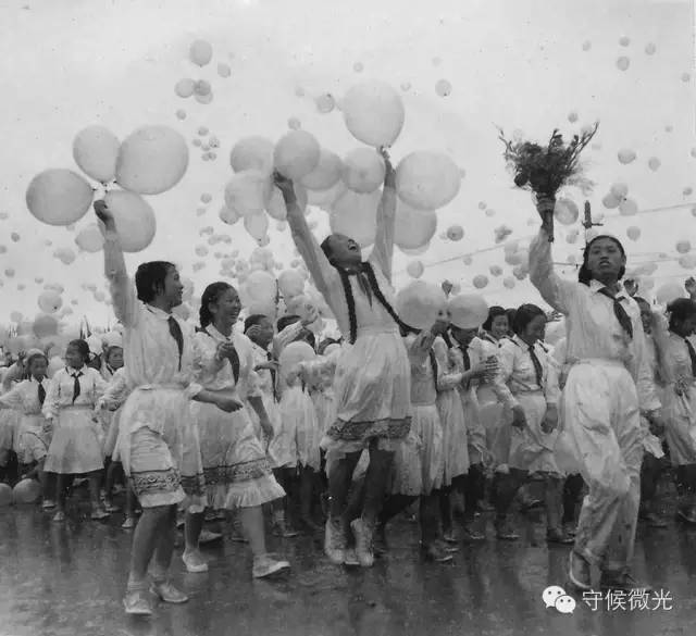 1956年國慶,參加游行的青少年在天安門廣場放飛氣球。