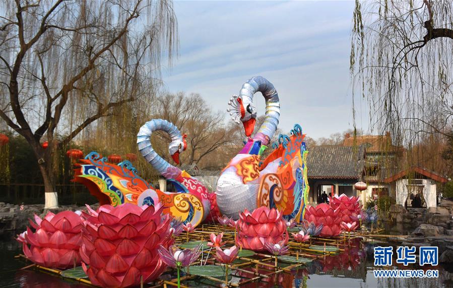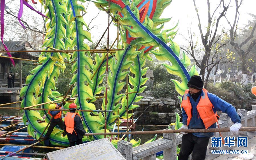 1月9日,在濟南市趵突泉公園,工作人員在布置一組大型花燈。新華社記者徐速繪 攝