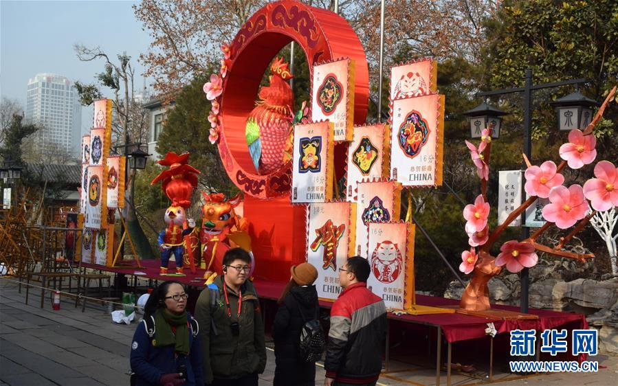 1月9日,在濟南市趵突泉公園,一組慶賀雞年的大型主題花燈正在布置中。 新華社記者徐速繪 攝