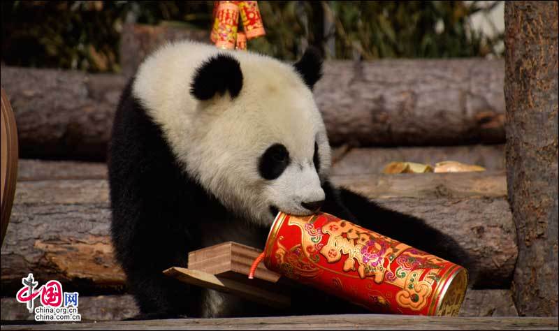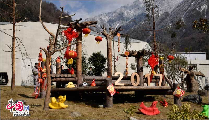 中國網(wǎng)1月13日訊 1月12日,中國大熊貓保護研究中心臥龍神樹坪基地工作人員將熊貓幼兒園裝點一新,為2015級熊貓寶寶們布置了一個充滿新春喜慶氛圍的環(huán)境。 工作人員還特意買來金雞公仔,陪伴熊貓寶寶一起過雞年。熊貓寶寶們一會兒拿手碰碰,一會兒用牙咬咬,一會用手抱起來四腳朝天,像是向大家拜個早年。