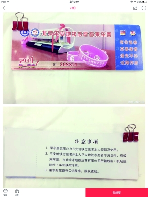有網(wǎng)友注意到在某二手交易平臺上,有人公開叫賣北京地鐵志愿者乘車票。昨日,北京晨報記者在該二手平臺上看到,賣家出售的車票上寫有“北京平安地鐵志愿者乘車票”字樣,票面上標(biāo)記了北京地鐵和志愿北京的標(biāo)志,票面左下角還寫有“2017第一季度”幾個字。商品詳情中,賣家稱該票共計18張,售價為80元,可乘坐除4號線及機(jī)場線之外的地鐵線路。