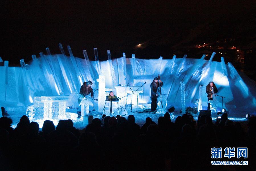2月10日,在挪威中部小鎮(zhèn)耶盧,藝人在冰舞臺(tái)上表演。風(fēng)格獨(dú)特的挪威冰音樂(lè)節(jié)于2月9日至12日在耶盧舉行,表演所用的全部樂(lè)器均由當(dāng)?shù)靥烊槐龀伞?新華社記者梁有昶攝