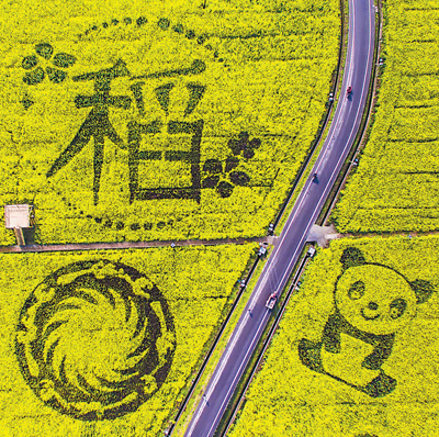 3月,成都崇州市油菜基地的油菜花次第綻放,路旁,錯(cuò)落有致的彩色帳篷掩映在滿目金黃的油菜花田中。從空中俯瞰,太陽神鳥、熊貓等圖案的花田造型蔚為壯觀,40余畝的花海迷宮讓人流連忘返。