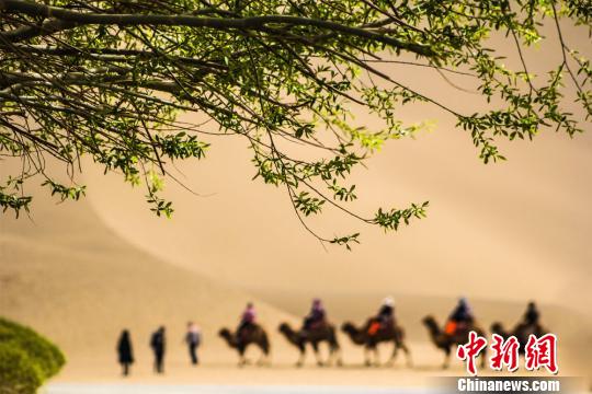 4月上旬,國際旅游名城甘肅敦煌花紅柳綠景色好,氣候宜人春光美。鳴沙山下,一派迷人的塞外風(fēng)光,吸引大批海內(nèi)外游客紛至沓來,觀光游覽。大漠上的駝隊(duì),猶如沙海行舟,形成了甘肅敦煌獨(dú)有的“大漠長龍”景觀。