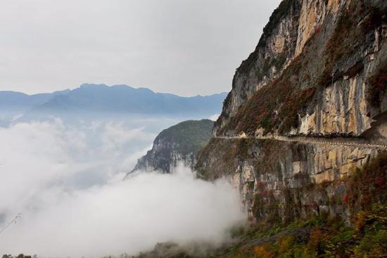 在重慶市開州區(qū)滿月鄉(xiāng)雙坪村有一條特殊的農(nóng)村公路——盤旋于海拔1500多米的高山,上方是巖石,外側(cè)是絕壁深淵,云霧繚繞,險(xiǎn)象環(huán)生,被稱為“懸崖天路”。