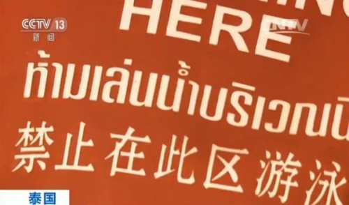 央視記者 陳林聰:我現(xiàn)在所在的位置就是普吉島的巴東海灘,也就是12號早上溺水的現(xiàn)場。在現(xiàn)場我們可以看到,海浪并不高,但是在岸邊我們依然能看到這樣的紅色警告旗子,提示游客這一區(qū)域并不適合游泳。這樣的旗子在沒有風的情況下是無法看到上面的警告的,只有在有風的情況下,或者打開旗幟的時候,才可以看到。上面有4種語言來表示禁止在這一區(qū)域游泳,(中間警告旗特寫畫面插入)像這樣的紅色的警告旗會在相隔50米的沙灘上被豎立起來。
