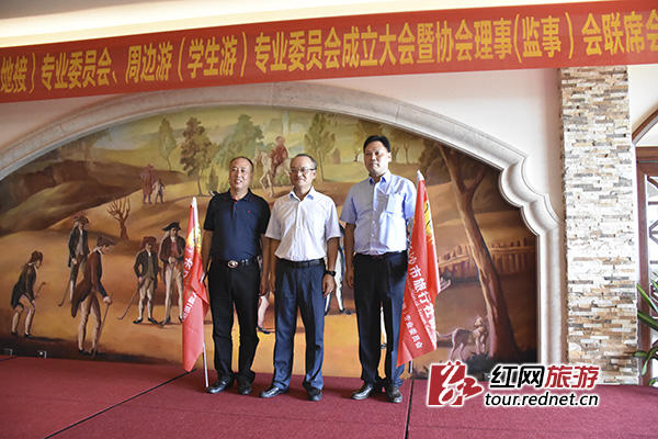 長沙市旅行社協(xié)會會長王應(yīng)榮(中)為兩個專業(yè)委員會授旗,入境(地接)專業(yè)委員會主任委員許劍(左)、周邊游(學(xué)生游)專業(yè)委員會主任委員徐湘江(右)接旗。