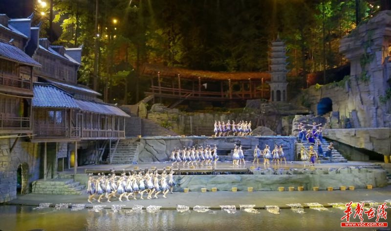 舞臺(tái)位于鳳凰古城外的森林劇場(chǎng),巧妙設(shè)計(jì),實(shí)景山林、綿延遠(yuǎn)山、江水靈動(dòng)、吊腳樓星羅棋布,如水墨丹青,實(shí)景呈現(xiàn)出一座煙雨詩(shī)畫般的鳳凰古城。