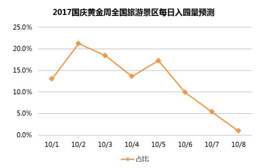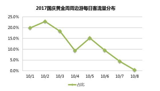 《報告》數(shù)據(jù)顯示,國慶黃金周期間周邊游的出游人次占比最高,出游時間主要集中在假期的第一天和第二天,前兩天的客流量占比預(yù)計將達到42.8%。與景區(qū)旅游客流分布類似,由于中秋節(jié)的原因,整個長假的周邊游客流量在10月4日形成了一個明顯的波谷,在10月5日客流量又有明顯拉升。