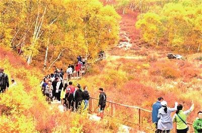藍天白云下,木棧道一路延伸到大山深處,山谷里各種植物色彩炫麗,紅彤彤、金燦燦、黃橙橙,相互交織,恰似“萬山紅遍,層林盡染”。山谷中的白樺林夾在一片暖色中,尤顯迷人。經(jīng)過開發(fā)的馬鞍山將沿線最美的景觀呈現(xiàn)出來,溝上溝下,走一圈要上萬步,讓游人完全沉醉于天然氧吧的清爽空氣中。山腳下村里特色的農(nóng)家風味也分外引人,鄉(xiāng)村游正在給當?shù)剞r(nóng)民帶來更多實惠。村民王大志說,今年旅游公路的開通,將馬鞍山與土右旗的九峰山連通到了一起,城里來玩的人更多了。張海芳 攝