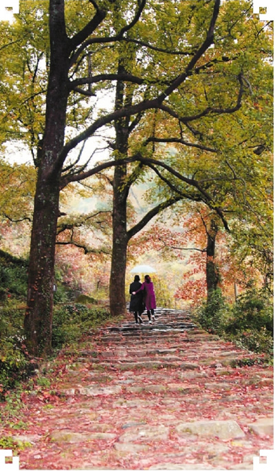 遙望天臺(tái)山,楓紅杏黃,層林盡染,被雨水潤(rùn)澤過(guò)的山道顯得愈加純樸而清爽。穿過(guò)山腳下的小村落,轉(zhuǎn)上一座爬滿青藤枝蔓的古拱橋,順著山澗小溪拾級(jí)而上,便踏上了南黃古道。南黃古道路面用石子鋪砌,整齊而規(guī)則,每一顆石子都已經(jīng)被先人的足跡打磨得溜光圓滑。一路向上,山勢(shì)緩和,古道纖細(xì),蜿蜒而上,每間隔一段距離,順著坡勢(shì)砌出幾級(jí)石階,使人行走時(shí)稍顯平坦。