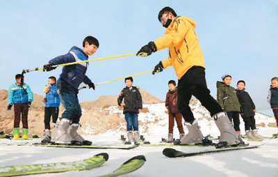 圖為在甘肅省山丹縣佛山滑雪場,近百名中小學(xué)生正在滑雪教練的指導(dǎo)下體驗(yàn)冰雪運(yùn)動(dòng)樂趣。