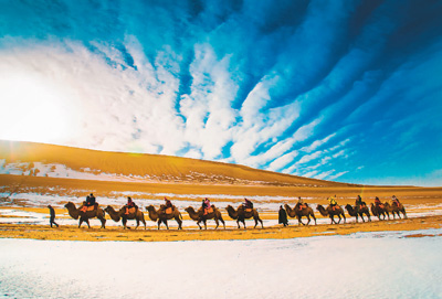 圖為游客騎駱駝體驗絲路風(fēng)情,欣賞大漠雪景。