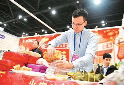 廣西電商年貨節(jié)日前在南寧舉行。圖為一名參展商準(zhǔn)備將產(chǎn)品給顧客品嘗。