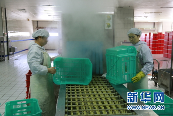 2月7日,北京京鐵列車服務有限公司配餐基地蔬菜處理區(qū)域,工作人員將各種蔬菜進行初加工。新華網(wǎng) 薛楓攝
