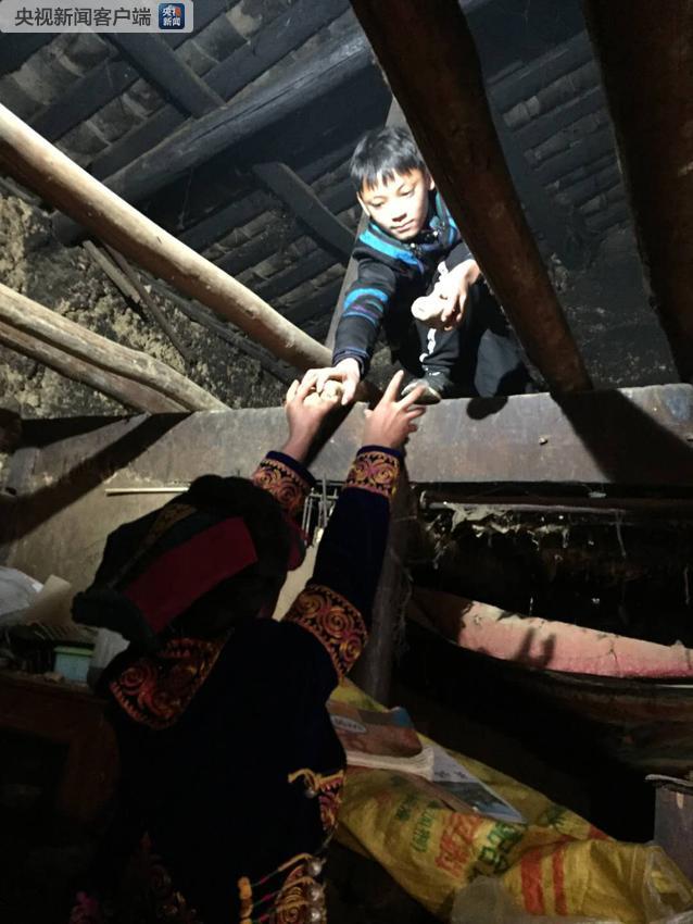 呷呷姐弟倆拿取架在房屋高處的土豆