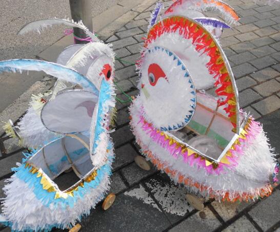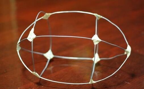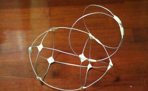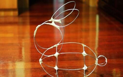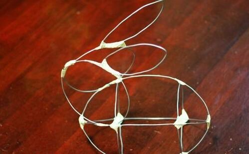 4.兩個(gè)最大的橢圓鐵圈交叉固定,制作出兔子的身體;兩個(gè)圓形鐵圈垂直固定燈籠。