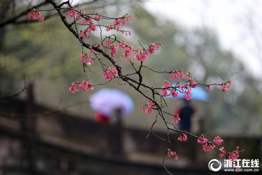 粉紅色的山櫻每年都是杭州太子灣公園的報(bào)春小天使,往往比郁金香提早一周、比日本晚櫻提早兩周左右開花。眼下,公園瀑布附近的山櫻已經(jīng)開花,在細(xì)雨中舒展著婀娜身姿,向大家匯報(bào)春的信息,分外美麗。
