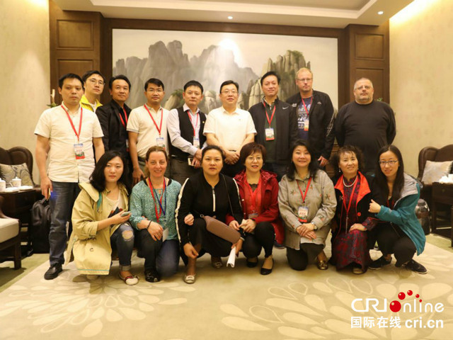 5月9日,三清山風(fēng)景名勝區(qū)黨委書(shū)記諸立(二排右四)在接受采訪后與外媒記者以及國(guó)際在線(xiàn)記者合影留念。攝影 石沛杰