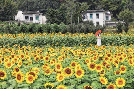 蜀源村位于黃山南麓,四面環(huán)山,古樹參天,有水環(huán)流貫穿全村。這里不僅有大美天成的山水風(fēng)光、星羅棋布的徽州古村落,充滿徽州風(fēng)情的特色民宿,還有一片向日葵花海。進(jìn)入秋季,成片的向日葵正競相綻放,金燦燦的向日葵與原生態(tài)景觀相應(yīng)生輝,充分彰顯蜀源原生態(tài)的秋色之美。