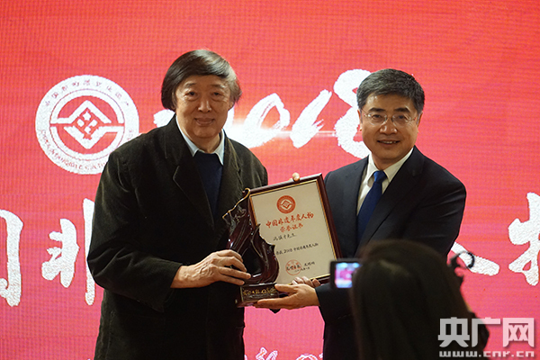 中國民間文藝家協(xié)會第九屆名譽主席馮驥才(左)領(lǐng)取榮譽證書(央廣網(wǎng)記者胡瑩瑩攝)
