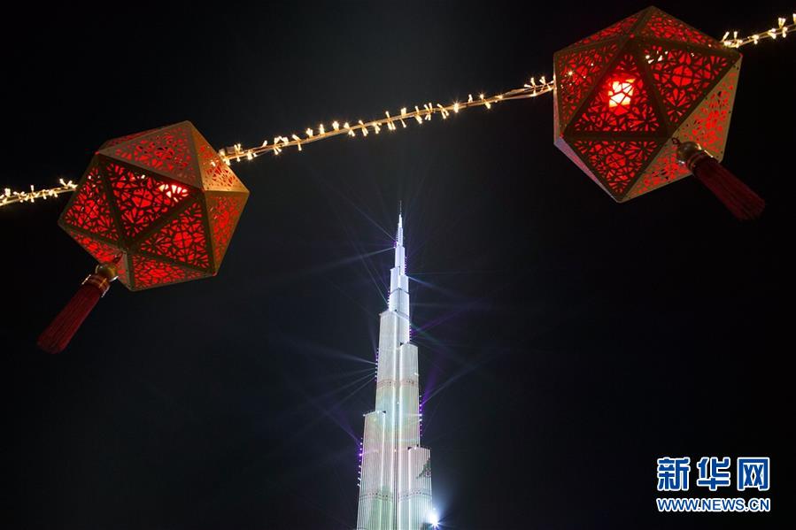 在阿聯(lián)酋迪拜,世界第一高樓哈利法塔上演春節(jié)燈光秀,迎接中國新年。新華社發(fā)(馬哈茂德·哈立德 攝)