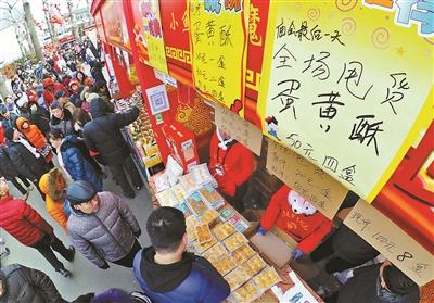 北青報記者發(fā)現,在最后一天,對于甩貨,兩大廟會的態(tài)度有所不同。在龍?zhí)稄R會,甩賣切實體現在小吃展位前!翱爵滛~便宜了!50一套3串!”在烤魷魚的展位前,商戶拿著喇叭對著廟會的游客們吆喝叫賣,“來一套吧!”在商戶的叫賣聲中,不少游客被“便宜賣”“降價”等字眼吸引而停下腳步。而在另一側的預包裝食品區(qū),蛋黃酥從20元一盒降價為50塊錢4盒,展位上方還貼著“廟會最后一天,全場甩貨,一盒不留”的字樣,引得游客把展位圍得里三層外三層。