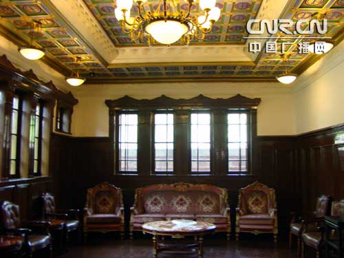一樓正面辟門三處,中為半圓形上亮過道門,兩側(cè)為半圓形群體組合門。正視二樓平臺與三樓的兩個突出半圓體陽臺。都是水泥花格,上曲裝飾三角紋,半圓形,瓶式欄板,廊柱,圓形柱頭等。樓內(nèi)所有的辦公室、客廳、會議室、起居室等都保存的相當完好。