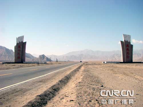 經(jīng)過南山口收費站不遠(yuǎn),兩座矗立于青藏公路兩邊,壯觀的紀(jì)念石碑就會撞入人們的眼簾。東側(cè)碑石上刻著“萬山之祖”,西側(cè)為“巍巍昆侖”。八個紅色的大字在陽光的照耀下閃閃發(fā)光,異常醒目。隨行的格爾木旅游局司機小嚴(yán)告訴記者說:“這個標(biāo)志就意味著從這里開始就進(jìn)入了昆侖山。