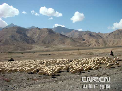 行進(jìn)在青藏線上牧民轉(zhuǎn)場的羊群