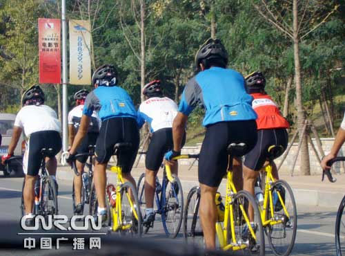 在大連前往旅順公路上行進(jìn)的自行車運(yùn)動(dòng)隊(duì)的矯健身姿