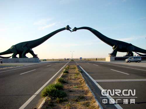 記者曾與2005年8月來(lái)過(guò)這里,然而三年過(guò)去了,當(dāng)記者再次驅(qū)車駛進(jìn)這座城市時(shí),不禁為二連短短幾年的巨大發(fā)展變化感到吃驚。在當(dāng)時(shí)還未竣工的通往二連的公路上,如今在即將進(jìn)入二連時(shí),拔地而起一座壯觀的恐龍門立于大道的中央。在一側(cè)恐龍的基座上中蒙文的“中國(guó).二連浩特” 幾個(gè)大字在夕陽(yáng)的照耀下金光閃閃。穿過(guò)恐龍門后道路兩側(cè)的草原上分布著98座銅制的各種恐龍的造型。
