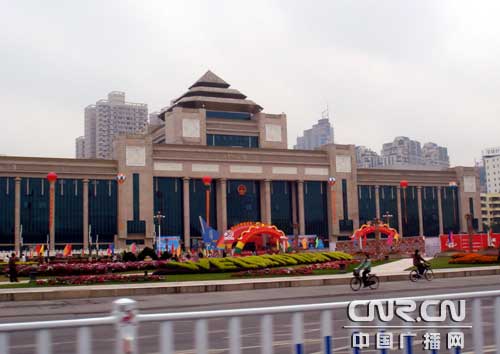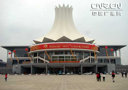 駛離青秀山風(fēng)景區(qū),記者一行驅(qū)車最后來到南寧國(guó)際會(huì)展中心。南寧會(huì)展中心是中國(guó)--東盟博覽會(huì)永久會(huì)址,由德國(guó)gmp設(shè)計(jì)公司和廣西建筑綜合設(shè)計(jì)研究院合作設(shè)計(jì)。主建筑設(shè)計(jì)獨(dú)具匠心,構(gòu)思巧妙,依山就勢(shì)而建,顯得氣勢(shì)恢弘。會(huì)展中心正面懸掛著中英文的“熱烈慶祝廣西自治區(qū)成立50周年”的巨大橫幅異常醒目,透著一股節(jié)日即將來臨的喜慶氣氛。