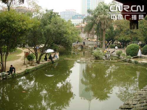 午飯后記者一行驅(qū)車來到南湖公園的名樹博覽園。南湖公園位于南寧市東南,是一個(gè)融水體景觀、亞熱帶園林風(fēng)光于一體的公園。面積126.6萬平方米,湖面占四分之三。湖上有九拱橋、長(zhǎng)堤、風(fēng)景橋,設(shè)有各色游艇和魚餐館。湖水澄碧,湖面藍(lán)天白云倒影,湖岸芳草綠樹相依。