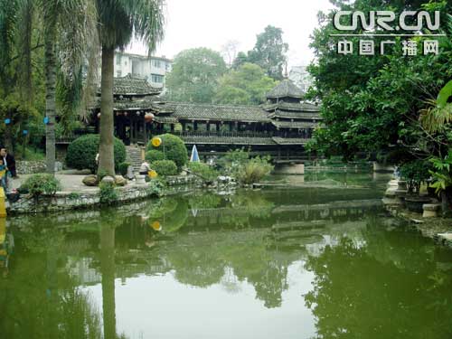 走進(jìn)文物苑侗族風(fēng)格大寨門之后,迎面是一個(gè)正在修繕中的巨大銅鼓,它集中體現(xiàn)了廣西銅鼓之鄉(xiāng)的民族特色。繞過銅鼓后,一座壯觀的侗族風(fēng)雨橋映入人們的眼簾。在橋的周邊是一片景色秀麗的人工湖泊,名為文翠湖。只見不少南寧的市民,紛紛圍在湖畔安逸地進(jìn)行垂釣。
