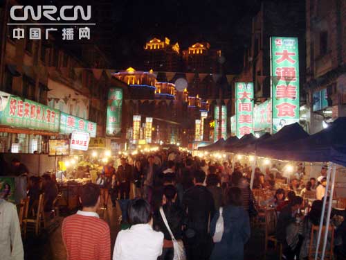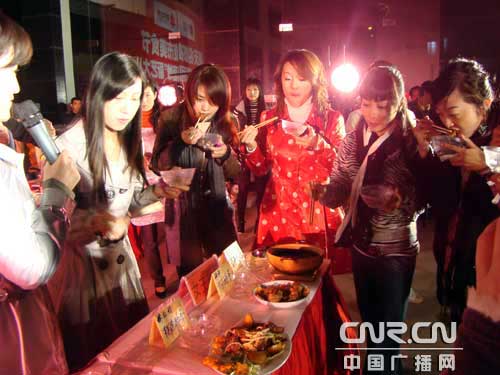 由于記者以前曾經(jīng)光顧過這里,故當(dāng)晚應(yīng)邀來到了南寧市的一個(gè)更加熱鬧的地方。這里正在進(jìn)行著一個(gè)由南寧電視臺(tái)舉辦的“‘美麗廚娘’廚藝大比拼”的活動(dòng)。由于參與比拼的廚娘,都是南寧市民廣為熟悉的節(jié)目主持人,所以引起了人們的極大興趣。只見位于美食街上的活動(dòng)現(xiàn)場(chǎng)燈火輝煌,圍滿了前來參與的熱情觀眾。
