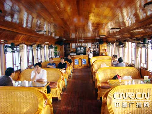 記者雖然沒有體味到乘帆船游海的獵奇,但是坐在寬敞舒適的大游船在海上遨游的感覺卻是異常愜意。游船分上下兩層,上面為觀景看臺,下面是休息和用餐的地方。人們即可以坐在艙里舒舒服服地透過窗戶觀賞海上的精致,也可登上二層的甲板,近看附近的島礁,遠眺遼闊的海天一線。由于在海上要游覽五個多小時,所以游人可以盡享下龍灣的海景秀色。