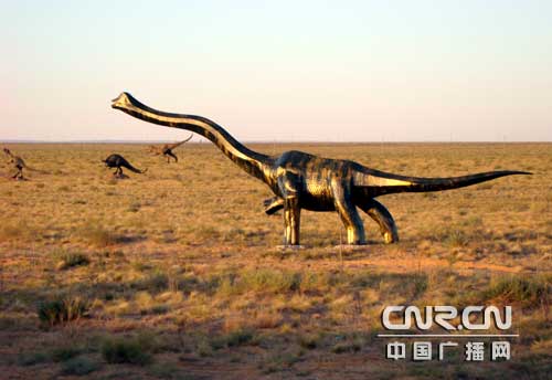 記者曾與2005年8月來過這里,然而三年過去了,當(dāng)記者再次驅(qū)車駛進(jìn)這座城市時(shí),不禁為二連短短幾年的巨大發(fā)展變化感到吃驚。在當(dāng)時(shí)還未竣工的通往二連的公路上,如今在即將進(jìn)入二連時(shí),拔地而起一座壯觀的恐龍門立于大道的中央。在一側(cè)恐龍的基座上中蒙文的“中國.二連浩特” 幾個大字在夕陽的照耀下金光閃閃。穿過恐龍門后道路兩側(cè)的草原上分布著98座銅制的各種恐龍的造型。