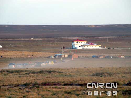 當(dāng)天下午在參觀完恐龍埋藏館后,車隊(duì)前往二連市南郊外50多公里處的一座草原上的蒙族度假村。這是二連市旅游局為歡迎國慶期間來自首都北京的自駕車隊(duì)所作的精心安排。車隊(duì)在茫茫無際的草原上行駛,經(jīng)過的地方被拉起了一道長長的土煙,景象極為壯觀。
