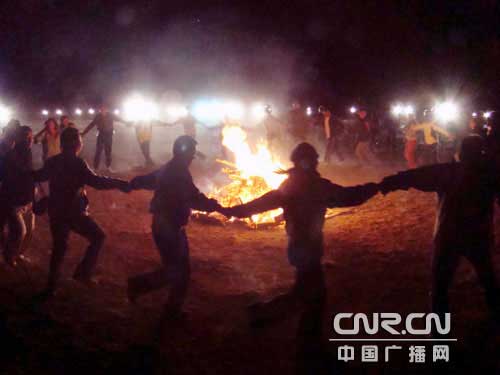 當(dāng)晚,車友們在飽嘗了一頓蒙族風(fēng)味十足的大餐之后,開始了載歌載舞的大聯(lián)歡。在度假村的草場上,一字排開的車隊(duì),每輛車都開啟了大燈照向草原,草場中間點(diǎn)燃了熊熊的篝火,車友們手拉手盡情地狂歡到夜晚。首日的二連行在夜晚草原的狂歡中圓滿地落下了帷幕。(記者 馮贛勇) |
