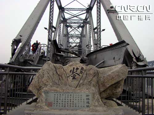 南面橋頭正上方的“鴨綠江斷橋”五個大字為遲浩田將軍題寫。從這里走上大橋能一直來到斷橋處。在大橋兩邊的鋼架上,有兩組很完整的《斷橋史話》與《戰(zhàn)爭與橋梁》的展板圖文并茂。游客在此不僅能了解斷橋歷史,還能眺望中朝兩岸秀美風(fēng)光。特別是通過斷橋上當(dāng)年被美國槍炮留下的累累彈痕以及斷橋石礅的歷史遺跡,使人不由自主地追思過去的戰(zhàn)爭歲月,從而激發(fā)自己的愛國熱情和報國之志。