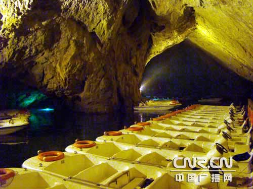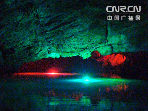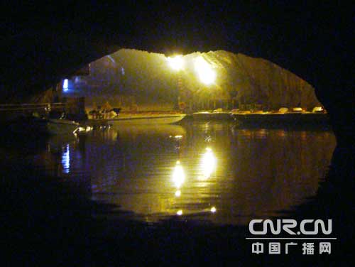 大廳正面,是通往水洞的碼頭,千余平方米的水面,宛如一座幽靜別致的“港灣”,燈光所及,水中游船、洞中石景倒映其中,使人如入仙境。車友們從護(hù)岸石階拾級(jí)而下,通過長(zhǎng)廊從碼頭上船后開始暢游水洞。