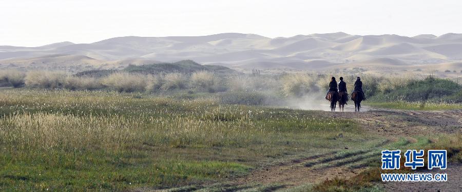 9月28日,游客在通湖草原景區(qū)騎馬。通湖草原景區(qū)位于內(nèi)蒙古和寧夏交界的騰格里沙漠腹地,景區(qū)匯集了沙漠、草原和湖泊,自然景觀獨特,吸引了眾多秋游的游客。 新華社發(fā)(劉玉和攝)