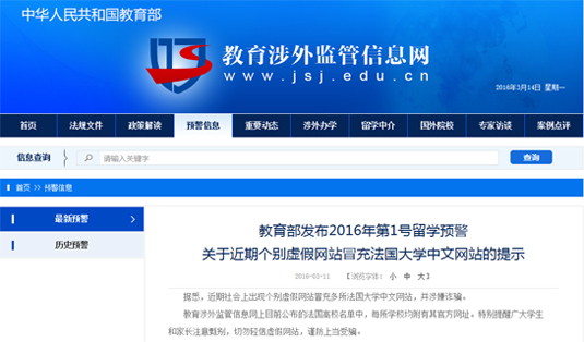 據(jù)教育部教育涉外監(jiān)管信息網(wǎng)消息,近期社會(huì)上出現(xiàn)個(gè)別虛假網(wǎng)站冒充多所法國大學(xué)中文網(wǎng)站,并涉嫌詐騙。為此,教育部發(fā)布2016年第1號(hào)留學(xué)預(yù)警,特別提醒廣大學(xué)生和家長注意甄別,切勿輕信虛假網(wǎng)站,謹(jǐn)防上當(dāng)受騙。