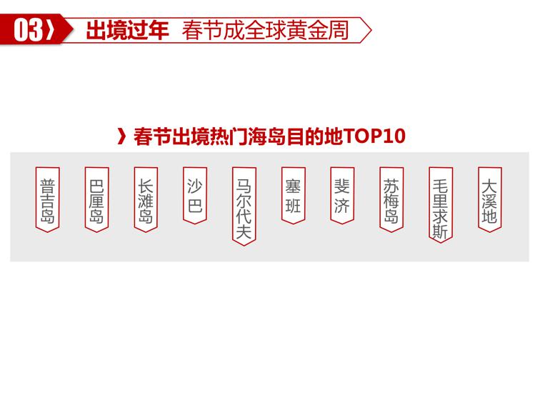 除了火熱的國內(nèi)長線游,今年春節(jié)用戶出境游需求增長也較為明顯。截至目前,泰國、日本、美國、法國、越南、新加坡、澳大利亞、菲律賓、馬來西亞、印度尼西亞為春節(jié)團(tuán)期預(yù)訂較為熱門的目的地。出境短線游仍是用戶的主要選擇,尤其是春節(jié)期間全家前往風(fēng)光優(yōu)美、溫暖舒適的海島更是人氣之選,普吉島、巴厘島、長灘島、沙巴、馬爾代夫、塞班、斐濟(jì)、蘇梅島、毛里求斯、大溪地在出境海島預(yù)訂中人氣排名靠前。對于親子家庭而言,海島游行程相對寬松,也方便父母隨時照顧孩子。此外,巴厘島、普吉島等地優(yōu)質(zhì)酒店林立,還提供嬰兒床以及兒童托管服務(wù)。