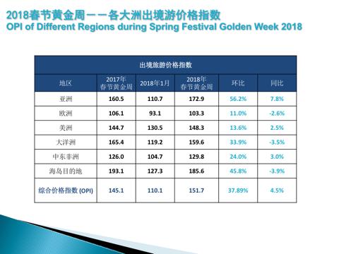 2018年春節(jié)黃金周出境旅游價格綜合指數(shù)(OPI)為151.7,均價上漲37.8%