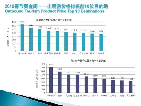 2018年春節(jié)黃金周期間,出境旅游價格綜合指數(shù)達(dá)到近年來的最高值,高于2017年的暑期旺季和十一黃金周的價格指數(shù),與2017年春節(jié)黃金周相比上漲4.5%。出境旅游價格指數(shù)大幅上漲,主要反映出春節(jié)黃金周期間出境旅游的需求十分旺盛。從團(tuán)隊游產(chǎn)品來看, 2018年春節(jié)黃金周出境旅游日均價格排前十位目的地為馬爾代夫、新西蘭、斐濟(jì)、澳大利亞、夏威夷、法國、加拿大、毛里求斯、德國、阿聯(lián)酋。