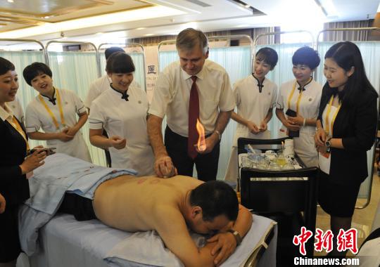 圖為摩爾多瓦文化部副部長波斯迪卡.哥奧爾基學(xué)習(xí)和嘗試演練拔罐技能。馬志強(qiáng) 攝